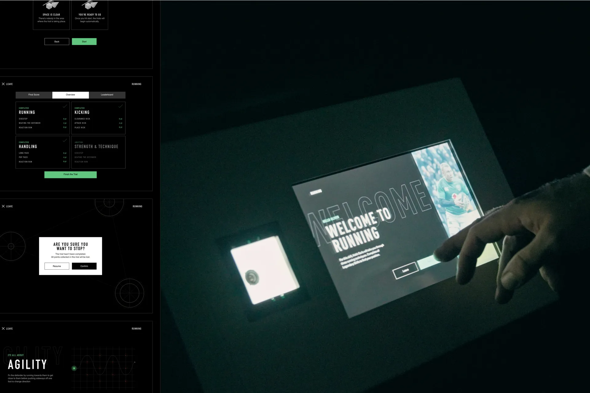 We collaborated closely with rugby experts to create four authentic drills that would replicate players' movements on the pitch - with each drill utilising the interactive space in different ways to keep the experience fast-paced and dynamic.